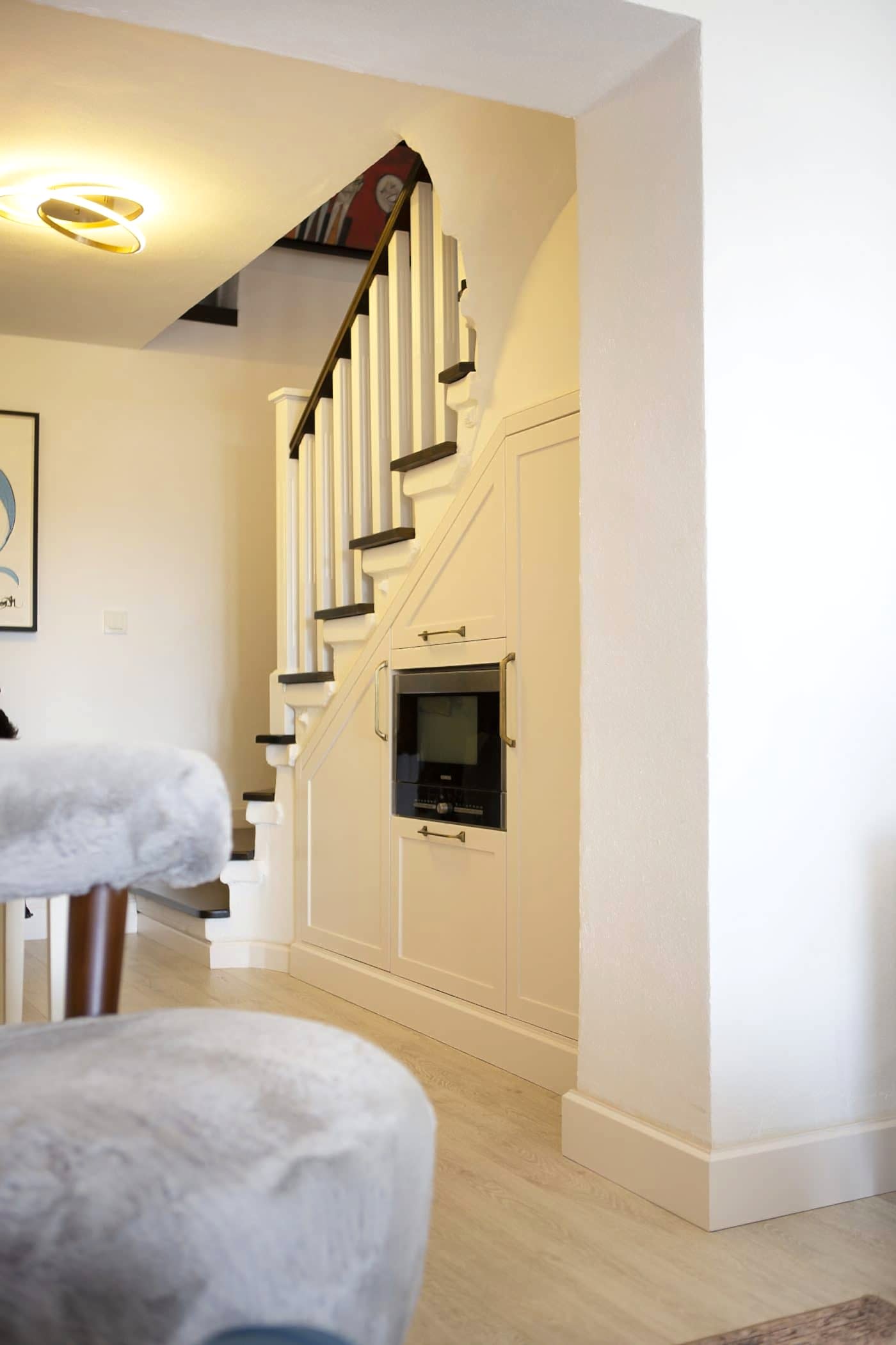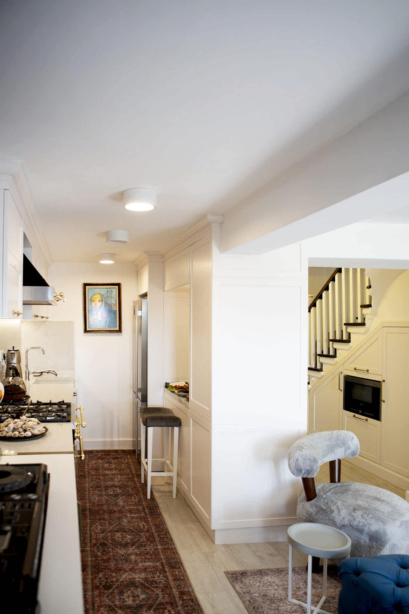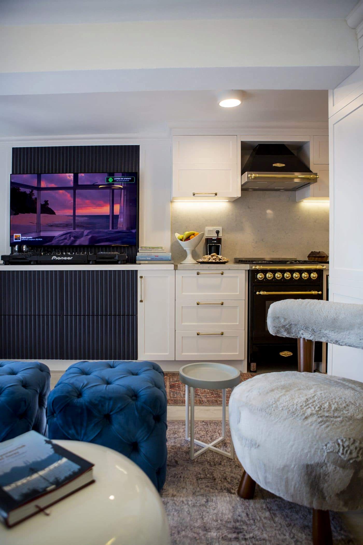 Güzel bir manzaraya sahip evin ışığını maksimum verim ile mekana yansıtmak amacıyla beyaz ahşapların yanında, tv alanını özelleştirdiğimiz antrasit pano ile mekana soluk getirildi. Öykü Hanım’ın zevkli mobilyaları ile tamamlanan projemiz bizim için keyifli bir tasarım ve uygulama süreci oldu.